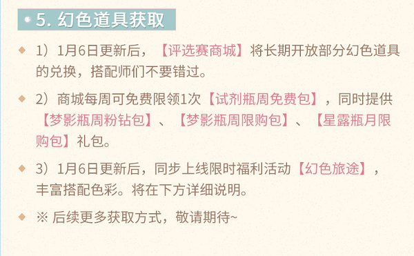 幻色道具获取方法 这个获取挺简单,分几种形式入手解锁,评选赛商店长期开放,商城每周无消耗领取一个,同时还能通过各种福利活动解锁,还有相关的专属礼包上架。