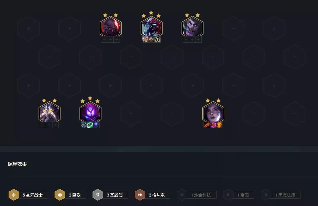 四、圣盾大嘴 1.阵容解读 圣盾大嘴在更新中略有削弱,盖伦大嘴均有削弱,但版本大部分阵容也均遭砍,强度变化不大,阵容方面现在更建议大家把坦度装备给予卡萨丁,强度不比盖伦差,在5变异下甚至比盖伦还优质。 2.装备推荐 出装方面前排盖伦狂徒、反甲/龙牙/石像鬼、饮血,卡萨丁离子、狂徒、反甲/龙牙/石像鬼,大嘴羊刀/法爆、巨杀、正义。 3.海克斯科技 海克斯强化最优DD街区、羽量级选手,变异心/魂/转,次选星界赐福,不稳定进化,圣盾/学院/枪手/狙神魂等。
