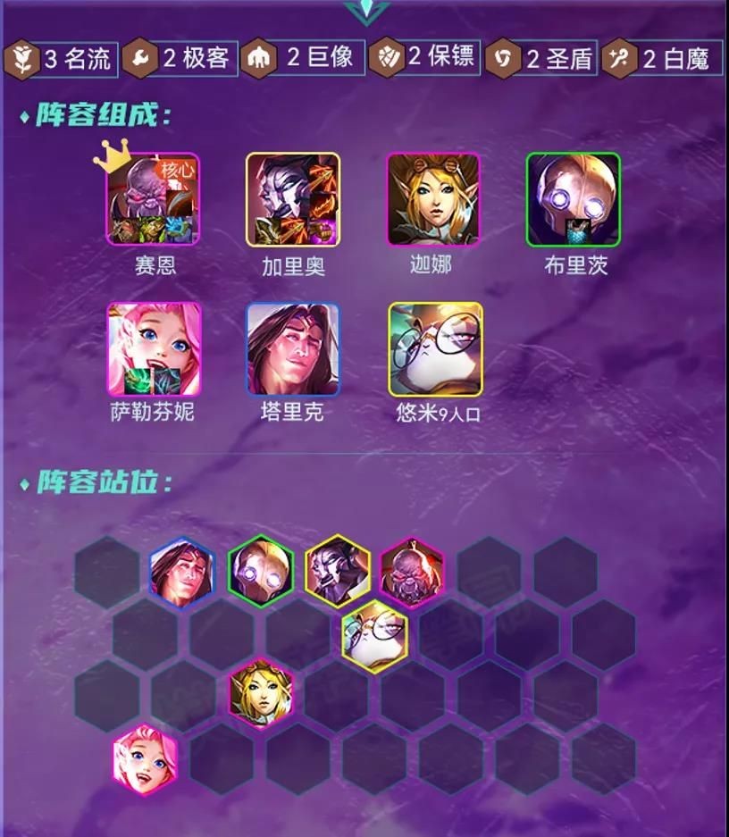 二、名流巨像/名流八九五 1.阵容解读 名流巨像在这次更新加里奥攻击力被大砍30,输出能力上与上版本相对弱势了一些,但经过测试阵容强度依然爆炸,加里奥1星就可吃分,2星就是吃鸡的1号种子选手。这版本阵容上无变化,阵容的难点依然是过渡,稳定过渡到8、9人口才是王道。 2.装备推荐 装备上主要考虑加里奥的装备,无尽必备,其他可考虑法爆、大天使、飓风,甚至羊刀、火炮巨杀都可考虑。其他装备考虑赛恩的坦度装备,如果敌方高续航可考虑给萨勒芬妮出装鬼书、青龙刀。 3.海克斯科技 海克斯科技方面最优名流心/魂,可让阵容快速成型,其他的白魔心/魂、护甲镀层,逆风斗志、直击弱点、飞升等也可考虑。