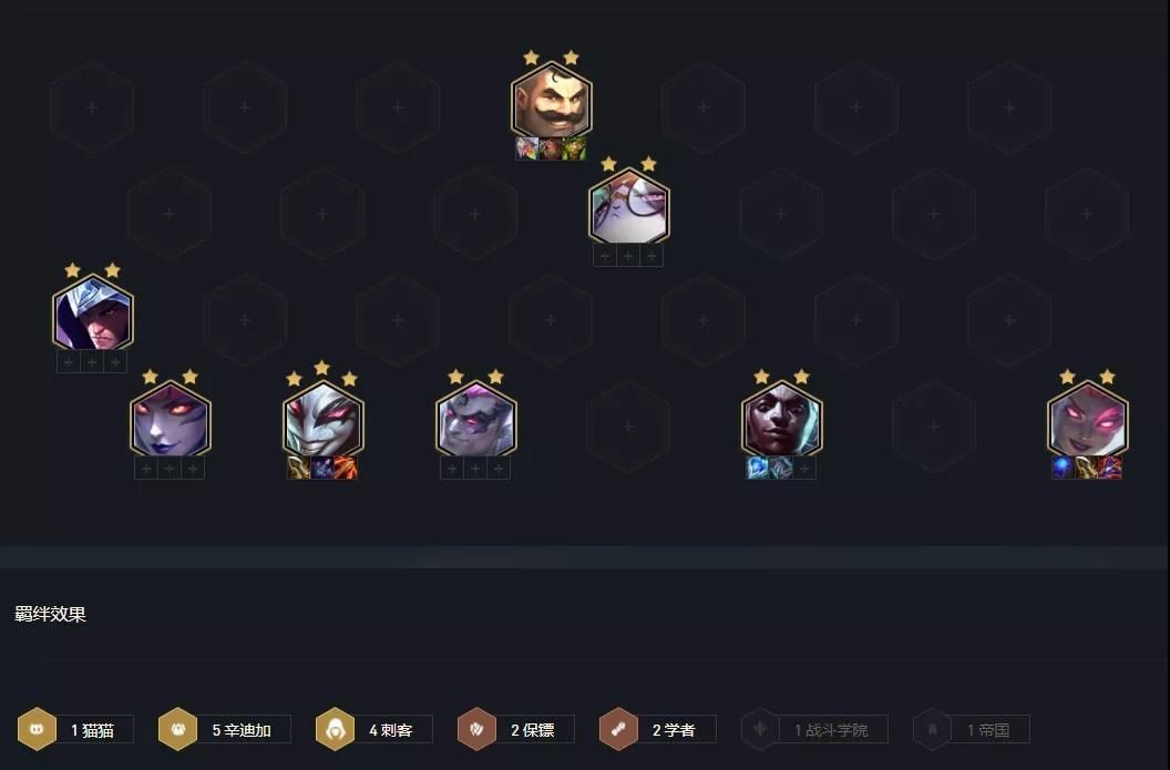 三、辛迪加刺 1.阵容解读 辛迪加在更新中双抗获得大增强,辛迪加刺客因此崛起,且强度大幅度攀升,今天对局测试中吃分与吃鸡强度非常高。过渡较为平滑,前中期卡特携带阿卡丽装的装备,稳血强度较高,只要不被针对或同行过多都能找到阿卡丽。这套阵容不是赌狗阵容,主C不是小丑,大家一定要注意。 2.装备推荐 装备上主要考虑阿卡丽与艾克的装备,阿卡丽无尽、蓝霸符(没有蓝霸符吃鸡费劲)、帽子最优,艾克冰心、鬼书,冰心是阵容必备装备,优先级高于阿卡丽的蓝霸符,萨科考虑出装无尽、轻语、飓风/火炮,坦度装备都给布隆救赎、反甲、狂徒最优。