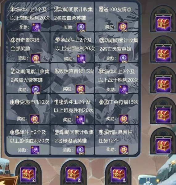 1.活动期间,玩家可以通过完成活动界面的各个任务来获得对应奖励。 2.每完成一个任务都会给对应的宝箱积攒进度,当完成了该行或该列的全部任务时,玩家可以领取宝箱中的对应奖励。 3.任务中对战斗胜利的要求条件包含佣兵及迷宫马车中的英雄。 4.当玩家主线到达31章,在通关的情况下,多队战斗中每一小场胜利都将单独计算。 5.在深渊迷宫的多队战斗中,每一小场胜利都将单独计算。 6.在深渊迷宫中参与“协战深渊”活动时,如果使用扫荡功能,不会增加"使用特定职业获得战斗胜利“系列任务的统计次数。 7.完成全部任务后,玩家可以获得一个英雄自选宝箱。