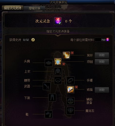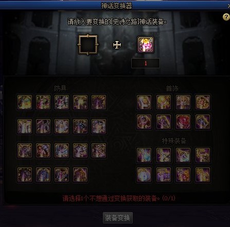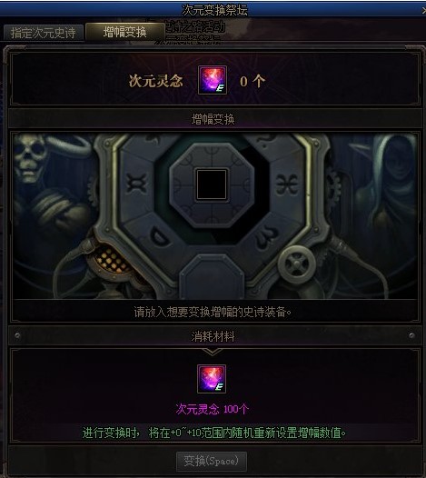 获得的史诗之路神话装备可以在次元变换祭坛中进行变换。每次变换可以选择1个不想通过变换获取的神话装备。 次元之庭: