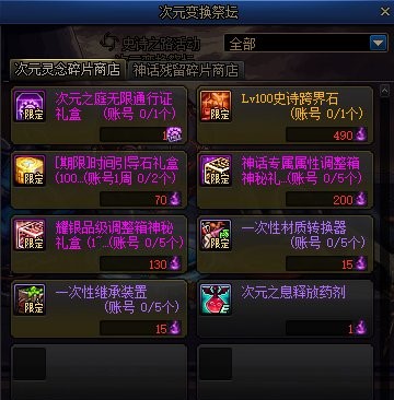 获得的次元灵念碎片可以在次元变换祭坛中兑换100级史诗跨界石、时间引导石礼盒、神话专属属性调整箱、耀银品级调整箱、一次性材质转换器、一次性继承装置和次元之息释放药剂。