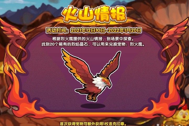 洛克王国火山情报活动玩法攻略 根据烈火鹰提供的火山情报,到场景中探查。找到20个稀有的烈焰晶石,可以用来兑换宠物:烈火鹰。 活动时间:2021年12日10日-2022年1月20日 活动地图:同心山顶 活动获得:烈火鹰,洛克印章