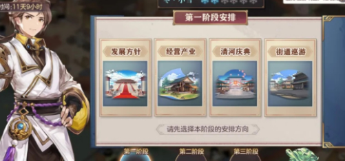 活动分四个季节。每个季节有六天。每天都是一个节气。 每个节气都可以去街道巡游。选对地方就会有固定的特殊剧情。 只要特殊剧情选对路线。属性值就会暴涨。 这次活动。四个产业属性50以后。随便主升一个。然后看自己,有钱就发展你主选择的产业。没钱就去经营产业赚钱,可以选自己的主发展的旗下产业赚钱。 然后固定下,每天第三阶段本街道巡游,选对地方触发特殊剧情。 只要你每天第三阶段固定去街道巡游。选对了就会有至少有两种100的属性增加,还有100荣誉。比自己发展产业高很多很多。
