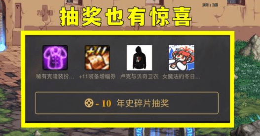 随机抽奖 每次抽奖消耗10个碎片,可随机获取“透明天空套、+11增幅券、卢克实物卫衣、女魔法师帆布袋、20个引导石、5个雷米、10个饲料”中的一种,大概率是“后面三种”,在兑换完了所需奖励后,可以考虑多余碎片抽奖。
