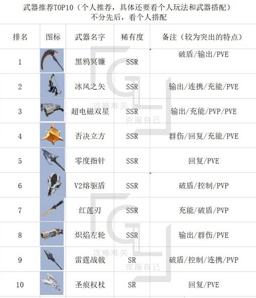 有优秀的控场控制,外加连携技能(qte)范围冰墙,主动技能aoe输出,整体来看综合都很强。连招主要是通过空中连击重伤,倍率可观,和镰刀差不多。 缺点:升星全部都是增加肉度,没有哪颗星质变。不依赖升星但又没特别特别nb到改变战场格局的能力。 6.其他武器我就不一一列举了,各种弓啊枪啊的输出都不错,各位自己可以解析。 以下武器可以看情况各位根据自身抽取搭配练。0星排名。 ///武器强度排行节奏榜