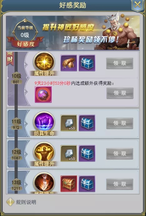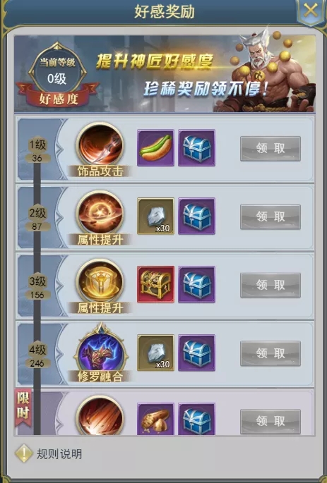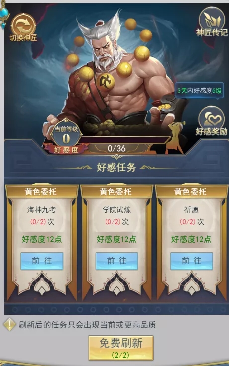 神匠笔录说明 功能开启等级 玩家1角色等级达到神官前期1阶 功能简介 完成神匠委托任务,提升神匠好感度,获得神匠赠予的奖励和属性提升,探索神匠的故事。 规则介绍 功能说明:玩家可以在神匠笔录中完成神匠的委托任务,获得神匠好感度,当好感度累积到一定数量,神匠好感度等级会提升一级,提升神匠好感度,可以获得道具和属性奖励 因委托任务涉及玩家的一些日常活动,为保证玩家体验,神匠笔录将会在玩家达成等级后的凌晨5:00向玩家开放入口,玩家点击激活后,神匠功能开启,限时任务开始倒计时 委托任务有五种品质,品质依次为:白色委托(10点好感度),黄色委托(12点好感度)、紫色委托(17点好感度)、黑色委托(35点好感度)、红色委托(70点好感度) 玩家每天可领取委托任务奖励的次数只有3次 玩家可以通过刷新提升神匠委托任务的品质,对应位置刷新出来的任务品质不会降级(只会品质不变或提升),但是任务内容可能会发生变化。已完成的任务和红色品质的任务不会被刷新 每日早5:00,任务及任务奖励可领取次数会被自动刷新,其中,红色品质的任务不会被自动刷新掉 限时任务:玩家点击激活对应神匠以后,会有一批限时任务供玩家完成。在规定时间内达到指定好感度等级即可完成任务,完成任务可以额外领取包括神环凝珠在内的珍稀道具。机不可失,珍稀大奖就在眼前! 头像框奖励:达成好感度等级可以解锁神匠传记故事,探索传奇神匠的一生,全传记解锁更有珍稀头像框奖励! 展示界面 神匠选择: