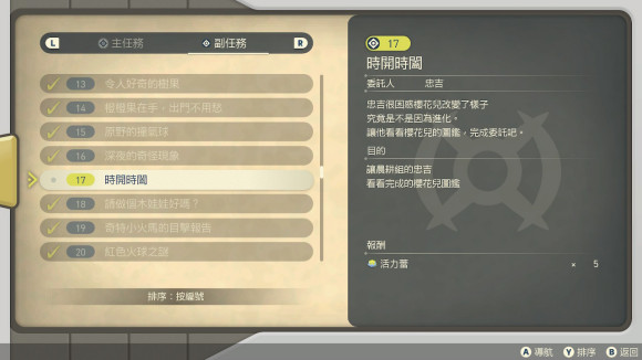 来到原野基地,拉笨博士和小照在等着我们。 图鉴课题指的是为了完成宝可梦图鉴所必须做的事,课题的内容及数量会随宝可梦的种类而有所不同,因此第一步请先按方向键的下键,打开图鉴确认有什么样的课题,在按ZL键注视宝可梦的情况下,打开宝可梦图鉴,就能方便地立刻确认图鉴课题,也有一些宝可梦有着比较奇特的图鉴课题,请一定要好还确认。