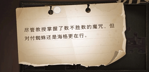哈利波特魔法觉醒10月9日的拼图碎片在哪里?哈利波特手游更新了10月9号的拼图线索,但是还是有很多朋友不知道具体位置在哪,下面就为大家分析介绍一下。 哈利波特魔法觉醒10月9日拼图碎片位置一览: 线索1:尽管教授掌握了数不胜数的魔咒,但对付蜘蛛还是海格更在行。