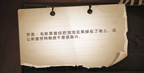 线索3:罗恩韦斯莱曾经把泡 泡豆荚掉在了地上,这让斯普劳特教授不是很高兴。