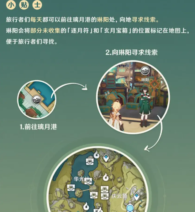 第一阶段,玩家可收集30个逐月符,发现进度未满时可对照判断是缺了箱子还是漏了符。若你嫌麻烦,不想重新按照路线再走一遍?这个简单,每天可前往璃月港NPC处寻求线索,她会将部分未收集的点位给你在地图上注明。