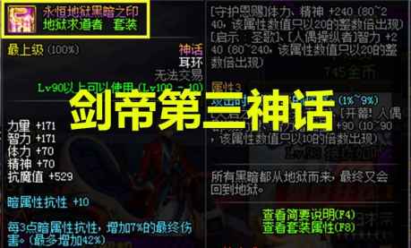 【三】永恒地狱黑暗之印 再看第三名的神话,是大幽魂神话耳环,装备搭配选择“工作服肩衣腰3件+吞噬愤怒2件+狂乱追随者3件+地狱求道者3件(神话耳环)”的2333混搭模式,装备数据为“额外爆伤104%,额外黄字103%,白字附加116%,所攻94%,三攻60%,力量智力105%,属强582点,技能攻击力199%,持续伤害20%,攻速79%,暴击25%,1-45级、50级技能+2级,60-80级,85级和100级技能+1级,装备提升率90737%,20秒打桩伤害7462亿,然后高达79%的攻速,刷图手感一流,特别是现在吞噬套的持续伤害BUG修复,也是不可多得的一套搭配。