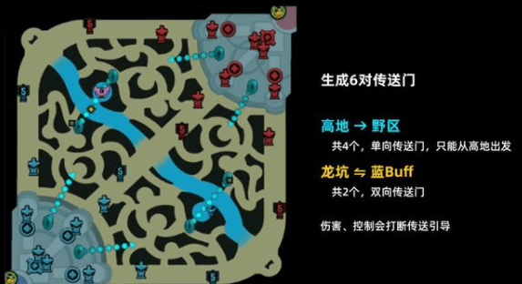 ②海克斯科技巨龙地形:如下图,一共生成六对传送门,高地到野区的只能单向传送,蓝Buff到龙坑的可以双向传送,利用传送门花式抢龙的时代要来了。
