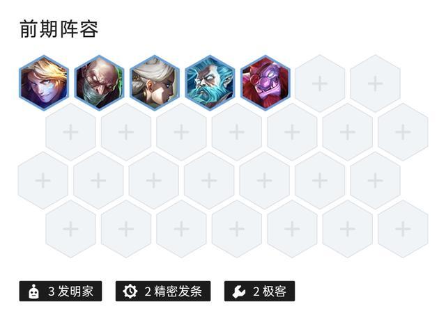 运营思路: 开局选秀拿大剑、眼泪或者腰带。大剑、眼泪做青龙刀,腰带做狂徒铠甲。海克斯选择自我修复、二进制、发明家之心、学者/白魔法师转职、星界赐福等。前期正常升级拉人口走连胜,留发明家棋子,找青钢影,装备给青钢影打工。 2阶段阵容就是EZ、炼金、基兰、青钢影。凑成3发明家、2精密发条。有发明家就直接上,多一个虫子战斗力提升不少。五人口上巨魔,有装备可以给巨魔,散件的话也都给上,这时有极客羁绊。3-2左右升六人口,上塔里克。没有塔里克就先上其他单卡比较强的棋子,有塔里克再换掉。期间有大头先不上,一星是比较弱的。尽量保证质量连胜,连胜不了就少掉点血。白到萨勒芬妮就可以开5发明家。