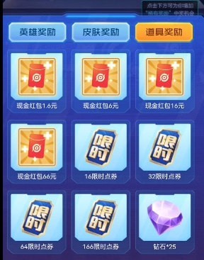 王者扭蛋季奖励 现金虹包16元、现金红包6元、现金红包16元。 现金红包66元、16限时点券、32限时点券。 64限时点券、166限时点券、钻石“25。 活动期间,玩家最多可以获取896元现金红包和278点限时点5活动期间,玩家最多可以获取1名永久英雄、1个英雄皮肤,玩家已有的皮肤和英雄不能重复抽取扭蛋获得;