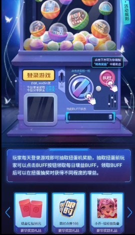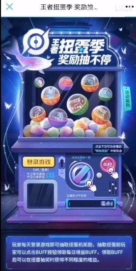 王者扭蛋季活动时间 2021年11月8日-2021年11月30日; 玩家每天可通过登录游戏和分享奖励获得两次抽奖机会; 扭蛋抽奖BUF每天可以抽取三种,玩家每天可抽取三种扭蛋抽奖BUFF,玩家可以领取两种,剩下一种可以分享给好友;