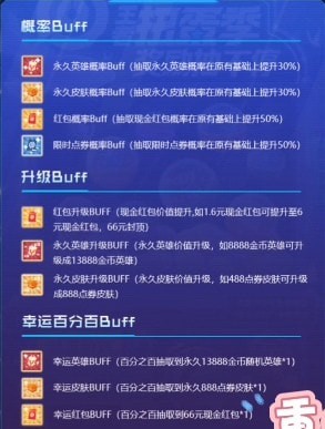 王者荣耀扭蛋季活动攻略 活动最好先把888皮肤拿到手,前面提到过有个大坑,个人觉得可能会有影响,也没法去验证为了避免损失,先拿皮肤。 首先每天抽到的buff卡自己合一次,大概率碎片,也可能直接百分百,再搞个号送一个合成后的碎片,这样一天两个碎片,六个碎片很快的,我打算在抽到百分百888皮肤buff前放弃每日两抽,只抽buff然后合成,避免抽到便宜皮肤,规则写的皮肤奖励最多获取一次,皮肤拿到手后面就可以每天抽两次了,然后用同样方法弄百分百现金的卡。 如果你就是为这278限时点券,那你就把所有bu卡用在这上面吧。