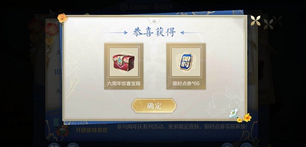 10月30日和31日,玩家只需要登陆游戏通过活动中心-周年祈愿/登陆送永久分享并参与活动,即可领取王者荣耀六周年惊喜宝箱,可任意选择红、紫、褐、蓝、绿、橙颜色惊喜宝箱之一,均有机会获得永久英雄、皮肤、10个皮肤碎片! 80%的几率抽到永久英雄。 19.99%的几率抽到永久皮肤。 0.01%的几率抽到10个皮肤碎片。 对此大家选择自己有需要皮肤的宝箱即可! |