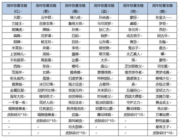 王者荣耀六周年惊喜宝箱活动奖励一览: 活动时间:10月30日0点开启-10月31日 固定入口:活动中心-周年庆-【周年祈愿/登录送永久】活动 活动规则:10月30日当天登录并分享活动,即可领取王者六周年惊喜宝箱*1(打开可选择任意颜色(红/紫/褐/蓝/绿/橙)周年惊喜宝箱之一:均有几率开出永久英雄、皮肤、皮肤碎片*10)。
