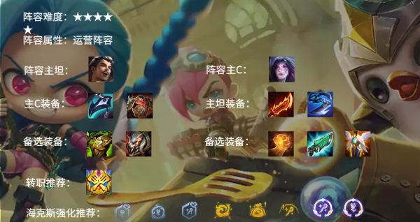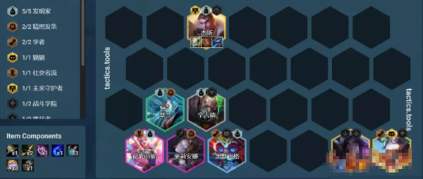 阵容搭配推荐 阵容组成:辛吉德、基兰、黑默丁格、萨勒芬妮、杰斯、奥利安娜、悠米、卡莎(8人口)、塔里克(9人口宝石) 阵容羁绊:5发明家、1未来守护者、1猫猫、2精密装置、2社会名流、2白魔法师、2学者、2战斗学院 海克斯强化(种族)选择:日炎棋盘(最佳过渡)、+1/2社会名流、学者+2、白魔法师+1/2/3、下一个人口刷新概率、利滚利、+1人口、假人等 转职建议:无,考虑自然之力