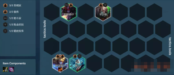 二、2-1拉4人口EZ、辛吉德、基兰、巨魔 开局装备优先拿反曲弓,前期优先做出羊刀,其次是巨杀,这两个装备是后期主C的核心装备。前期装备可以给EZ或者给巨魔打工都可以,一般EZ比较容易到2星,可以先给EZ打工,如果后续灯光在前排考虑换巨魔打工过渡。前期羁绊选择3发明家2极客打工过渡。