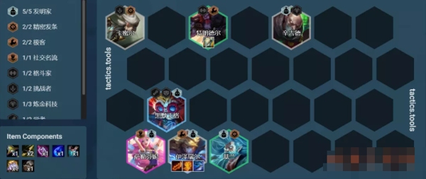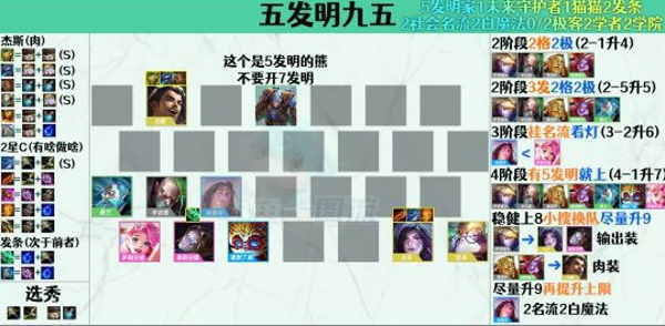 七、如果有发明家+1或者转职羁绊,可以考虑下辛吉德补充猫咪,这样就不用考虑直接拉9人口了,在8人口找到全部2星即可成型。否则还是需要拉9补充猫咪凑出2学者羁绊。 阵容分析解读 九五发明家是一套运营阵容,当然这套阵容更多的来说是一个运营思路,玩法其实非常简单,也非常适合新手玩家运营过渡,这是在美测服里面公认的最稳定强势的运营过渡思路。 这套阵容的强势点在于5召唤的狗熊,能够多次加全队伍的伤害,而且狗熊有着非常不错的坦度是阵容的核心前排。再搭配高强度的5费卡、白魔法和社会名流就能够凑出完美羁绊。非常适合当前版本以5费主C为核心的运营阵容。