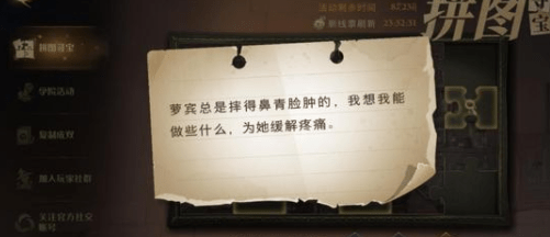 罗宾总是摔得鼻青脸肿,我想我能做些什么,为她缓解疼痛。这是哈利波特魔法觉醒手游10月11号的拼图线索之一,很多玩家不知道指的是哪里,下面就介绍一下10月11号的拼图碎片位置。 1、在这里,你时常能见到赫奇帕奇学院的院长。