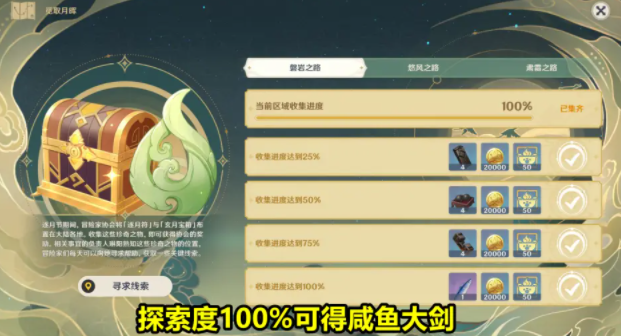 当找齐所有的宝箱和逐月符后,第一天的探索度会达到100%,可以获取“咸鱼大剑”,但是还没完,后续还有武器的精炼材料! 个人是非常不喜欢这个任务的,虽然给到的原石数量很多,但是要跑的地方实在太多,按照我的地图标注,刨除掉位置重合和距离十分接近的宝箱、逐月符,玩家也至少需要跑58个点位。