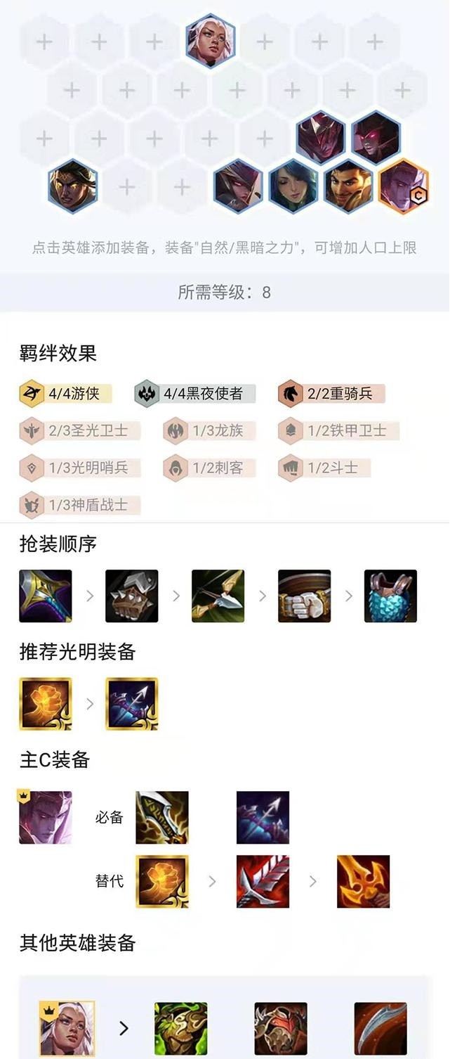 云顶之弈中的装甲炮手阵容如何搭配?装甲炮手是云顶目前强大的计分系统。阵容简单,易于组建,可以帮助玩家应对各种不同的情况,取得更好的分数。下面就来详细分析一下装甲炮手阵容。 铁甲炮手是以三铁甲跟四炮手为核心羁绊,主力大哥是卢锡安,自身技能输出强势而且可AD与AP双修,对装备的宽容度极高。如果卢锡安来不了,他可以变身游侠系统。厄斐琉斯调整后,技能伤害直接翻倍,是游侠的顶级配置。而且游侠的五费卡阿克山和一星装备就如同战神一般。 铁甲炮手体系塞纳、加农、枪手、卢锡安、加里奥、瑞尔、贾克斯、泰坦,八人组成三铁甲、三光哨兵、四突击炮手、两名骑士的配置。这套阵容中,卢锡安和女枪手是输出点,前排的承伤点是加里奥和瑞尔。加里奥是目前S5.5版本中最强的前排单位之一。他的英雄技能内置减伤效果,可以说是职业被打的第一人。 黑夜游侠体系韦鲁斯、艾希、厄斐琉斯、阿克山、娇月、盲僧、猪姑娘、睿儿,八人组成四游侠、四夜、二骑的配置。这套阵容中厄斐琉斯和阿克山是输出点,前排的抗伤害角色是瑞尔。经过强化后,游侠系统已经成为顶级的AD输出系统之一。阿克山单位拥有游侠的攻击速度加成和自身技能。它不需要任何攻速装备。这是需要注意的一点。 由于两个阵容互换性很强,所以直接放在一起介绍。 主C卢锡安(厄斐琉斯):无尽、轻语、死亡之刃、饮血、正义这两个主要的C兄弟主要有通用的AD配置。 Endless和Whisper的暴击破防组合非常好用,Endless在5.5版本中还提升了10%的暴击率。死亡之刃可以提升佩戴者的AD值,对于技能伤害来说是一个很大的提升。饮血剑是持续恢复装备,对输出帮助不大。正义之手的效果也不错,任意buff都会对C位做出贡献。 PS:由于卢锡安的技能伤害还包含AP,所以卢锡安还可以带魔爆、帽子等装备,但厄斐琉斯则不需要。厄斐琉斯的技能伤害是重要的一环,所以可以考虑将厄斐琉斯搭配青龙剑。 副C女枪(阿克尚):无尽、轻语、死亡之刃、饮血副C主要捡主C剩下的输出装备,小编给出的无尽、低语等装备是一个大概的范围。有时候只有窃窃私语,没有绵绵不绝,所以带上也是有必要的。 主T加里奥(芮尔):狂徒、龙牙、反甲前排装备差别不大。一套AD防御装备、一套AP防御装备、一套HP装备是前排的标准配置。至于兑换、传送门之类的功能装备,还是要看情况。前排肯定不适合装这种比较空的小玩意。 值得注意的是,游侠系统不需要攻速装备。新版本的游侠更注重伤害而不是刮A级。相反,突击炮手是A级羁绊,所以在搭配攻速装备时要小心。 搜卡节奏顺风局:速度八一路,八人搜索四枪手,三铁甲,三灯二骑士配置,综合素质两星后,准备九人,五费卡辅助阵容。 逆风局:如果前期六人口不顺利,花钱的目的就是补个四小鬼和二炮手的过渡阵容。后期如果游侠达到八人口后变成盗贼,可以改造游侠系统。通常情况下,逆风游戏不会将人口增加到九个。到了八人口阶段,会追加狮子座或者卢锡安的三颗星。如果有同行争夺女枪三星的话,可以考虑一下。 运营思路1-1 大剑和拳套是选秀初期可以合成的两件装备。可以合成的通用AD设备有很多,适用性很强。 第一阶段打野之后,连胜就正常了。最初推荐的工作阵容是小恶魔枪手系统。改版后,小恶魔不再是三五七的粘合配置,而是变成了二四六八的配置,更容易组建和担任打工仔。前期的核心输出点就是小炮。小炮也是炮手绑定的单位。使用小炮搭配AD装备,实现强势连胜。 在选秀和打野阶段,装备应该直接组合。工作期间,前排的克烈可以带加里奥的坦克装。如果亡命之徒和龙牙能结合,那就结合吧。 很多朋友都有攒装备的习惯,都想先攒装备,等以后看情况再考虑合成。这种想法只限于低段位,但是去过白金钻石的朋友是不会留装备的,因为虽然阵容强大,但是是没有装备的RZ体系,想要实现连胜只是一句空话和白日梦。因此,强烈建议组合装备。到了后期,神装就可以直接使用了。如果能稳住前四,就可以用三颗星拿鸡。 |