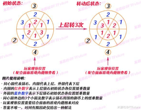 《根神清来逐雷记》第二部怎么玩? 《原神冲击清莱追雷》的第二个任务需要玩家前往封印镇石。在这个过程中,他们会遇到很多障碍。下面介绍一下如何完成《原神青来追雷》第二个任务。 原神清籁逐雷记其二攻略:1.前往封印的“镇压石” 这次要封印的“镇压石”的位置有点远。建议旅行者按照下图所示的路线,解锁两个传送点,因为接下来的三个传送点也会用到下图所示的1号传送点。 2.击败所有敌人 到达第二个“镇压石”并击败海兰吉。 敌人一共有3个,分别是凯兰吉·雷腾1、信·消防员1、信·技能班1,没有特效。 3.触摸“纸挂”(共3处) 和以前一样,首先要做的是触摸纸标签以释放面罩密封。附近只有两个纸质标签。第三个纸质标签不在附近。您可以看到它在地图上稍远一些。 去镇石北边的山脚下召唤雷种,然后利用雷极快速飞到山那边的海边。 之后,从海滩上的雷樱枝上召唤出雷种,利用雷极快速渡海。 飞过大海之后,来到了这里的山后。有雷樱枝,有神瞳。再次召唤雷种,就可以利用雷极飞向空中的岩石,到达挂纸的位置。上面还有一个普通的宝箱。当您靠近时,它会自动解锁。 4. 封城石 当三个纸竖都被触动之后,我们就可以直接传送回去,回到石头所在的位置,转身封印石头。以下面游戏截图所示位置观察为例。 注:下面的俯视图是根据当前位置绘制的。为了方便大家参考,这里特意说明一下。 初始状态(不旋转)俯视图,石头两侧上下纸片的数量,以及周围三枚帝制钱币的数量及对应关系如下图所示。 由于镇石旋转时默认是逆时针旋转,所以要达到目的,只需要在初始状态的基础上直接将上层旋转3次即可。 注意: 上述解决步骤仅适用于石头处于初始状态时! 但如果石头已经乱转了,那也没关系!根据你现在的情况,将其调成如上右图所示的状态即可。 如果觉得太麻烦,也可以通过穷举计算来解决,即把上面转一次,把下面转6次,再把上面转一遍,把下面转6次,如此类推,用不了多久。 匹配成功后,还有一个过场动画宣布我们的第二块石头被成功封印。 5.与悦子交谈 封印后,悦子和大佑会出现在真石身边,对话后,《清莱主雷记·下篇》就完成了。 |