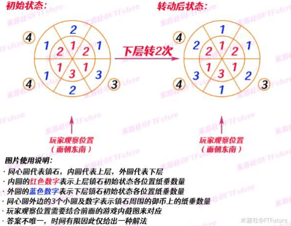 如何完成《原神》清来逐雷记第1部分?青来追雷是原神2.1版本中的新任务。它有4 个部分。完成所有任务可以获得大量奖励。下面就详细介绍一下清莱追雷的完成方法之一。 原神清籁逐雷记其一攻略:任务奖励:冒险经验300、原石40、英雄经验4、莫拉30,000 1.前往冒险者协会 前往闪电冒险家协会领取世界任务“青莱追雷”。 2. 青莱岛寻找冒险家 由于传送锚点尚未解锁,我们可以选择从附近的神奈冢出发,驾驶造浪船前往青莱岛,先在图中粉色标记处上岸,并解锁那里的造浪船锚点,然后前往任务目标点。 注意:七重神像不需要先解锁,因为后续任务中会经过七重神像,到时候解锁即可。 (仅代表作者个人观点,旅行者可以按照自己的习惯,如果习惯看全图,可以先解锁七重天像) 找到悦子小姐后,我也解锁了附近的传送锚点。 了解了一些基本信息后,我们发现他们并不是完全没有头绪。至少他们发现了一个叫“镇石”的石座,据说是封印用的礼器。 3. 前往调查“仙氏” 沿途按照任务指南解锁七重天像。到达目标地点后,会自动进入剧情。 4.跟随猫的脚步,探索前进 沿着小路走去看看。 注意:在这个阶段,在任务列表中选择追踪目标后,只要沿着地图的黄色区域走,你也会在路上看到猫的脚印。 5.探索神社 一路走,来到一座神社,解锁传送锚点,然后靠近神社门口即可触发剧情。 在认识了宫城大人“Boko”后,他答应告诉我们如何使用石头,但作为回报,我们也必须帮助他对神社进行一些修复。 对话结束后,会自动解锁一项隐藏的万物成就,——,“奴隶是一只猫,他的名字叫苏子”。 6.检查“充值钱箱”的状态 钱箱就在神社西边不远的地方。您可以按照指示到达它。当你靠近时,交互式地检查它以触发后续情节。 7. 前往村庄收集修复材料 神社里所有的修复材料都被福子处理掉了,所以我们只能去附近的村庄寻找。这里我们直接传送到刚刚解锁的七天神像,前往旁边的月石村。一旦到达,我们就可以触发后续剧情。 8.击败所有盗宝团伙 敌人一共有5个,包括火药师1、雷药师1、拳师1、掘墓者1、侦察兵1。所有敌人都没有特效,可以正常击败。 9. 前往宝藏盗贼营地 跟随导游前往宝藏盗贼团的营地。这里我们可以直接传送到我们第一次搜索悦子小姐时解锁的传送锚点,然后进入搜索范围。路线及盗宝团营地具体位置如下图: 10.击败所有盗宝团伙 营地里还有一群盗宝贼。营地中有4名敌人,分别是火药师1、冰药师1、掘墓者1、侦察兵1。敌人都没有特殊效果,所以只要正常击败他们即可。 11.在营地内寻找修理材料(共3处) 击败宝藏盗贼团后,营地中会出现3个调查点。经过调查,你可以获得修理钱箱所需的木板、绳子和钉子。 12.返回阿塞神社并修复“钱箱” 获得修复材料后,通过传送点直接回到浅濑神社,前往钱箱进行互动修复。 13. 向我汇报 修好钱箱后,福子还按照约定告诉了我们封印石头的方法。简单理解,就是旋转石头,使石头上下两部分的纸挂数之和等于对应方向的三枚帝制钱币的纸挂数。 14.触摸“纸挂”(共3处) 首先,我们需要触摸周围的纸以释放面膜密封。如果我们靠近,我们可以交互式地释放面具。 15.封印“镇压石” 接触到三个纸滴后,就可以开始调整石头重量了。以这里的镇石为例,首先让玩家站在下面游戏截图所示的位置进行观察。 注:下面的俯视图是根据当前位置绘制的。为了方便大家参考,这里特意说明一下。 初始状态(不旋转)下,石头两侧上下纸挂的数量俯视图,以及周围三枚帝制钱币的数量及对应关系如下图所示。 由于石锤旋转时默认是顺时针旋转,所以要达到目的,只需要在初始状态的基础上直接将下层旋转2次即可。 注意: 上述解决步骤仅适用于石头处于初始状态时! 但如果石头已经乱转了,那也没关系!根据你现在的情况,将其调成如上右图所示的状态即可。 如果你觉得这样太麻烦,也可以通过穷举计算的方式来解决,即把上面转一次,把下面转6次,再把上面转一遍,把下面转6次,以此类推,直到解出来,用不了多久。 匹配成功后,会进入一个过场动画,宣告我们的第一块石头成功封印。 《根神清来逐雷记》的任务之一已经完成。 |