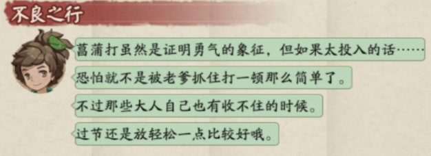 阴阳师端午节推出了许多新活动,问答活动就是其中之一。每天都会有一个关于端午节的问题需要大家回答。如果你回答正确,你就可以获得奖励。这里为您汇总了阴阳师端午节的答案。 阴阳师端午节答题答案大全:6月9日题 以下哪个不是端午常见的物品?选项:1.彩绸、2.菖蒲、3.红包 答:红包 6月10日题 端午节常有与马有关的庆祝活动,其中不包括?选项:1.赛马、2.赛马、3.赛马投注 答:赌马6月11日提问: 小孩子不可以在端午节做什么?选项:1.挂鲤鱼旗,2.穿纸甲,3.真刀真枪打斗。 答:真刀真枪地打菖蒲合战 和塔一样,船越早开越好(闲置划船)。喂食清明(右下角)可以增加距离。食物可以通过花战、左下角地图里的任务、商店里的氪金以及装饰船只的概率获得。 日志中有冒险,点击宝箱即可获得随机奖励 阴阳师重午节会玩法介绍: 活动开始后,等级15级的大人可以从庭院右侧的纸人处进入活动界面,创建一艘属于自己的船。活动期间,船只将不断前行,航行距离越远,解锁的奖励越多; 活动期间,成人通过完成花战任务,参与《近畿河原》中的“亚洲夏日乐趣”和“崇武斩”玩法,即可获得“崇武美食”。喂食不同的崇武美食可以增加船的航行距离; 浅香趣闻:《近畿河原》中,每天都会刷新战斗、捐献、答疑等三个有趣的任务。完成后可以获得崇武美食等奖励。 |