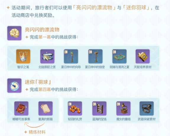 如何获得闪亮的漂浮物体?原神1.6版本新活动“仲夏!岛屿?大冒险!”要求玩家收集闪亮的漂浮物来完成任务并获得奖励。以下是如何快速获得闪亮的漂浮物体。 活动时间 游戏开放时间:1.6版本更新后~2021/06/28 03:59 活动商店开放时间:1.6版本更新后~2021/06/29 03:59 (温馨提示:请广大旅客留意活动商店开放时间,及时兑换奖励!) 参加条件 冒险等级21 并完成恶魔任务“龙与自由之歌”和四叶草第一章“真正的宝藏” 活动期间,解锁可力传奇任务“真宝藏”所需冒险等级将降低至21,且无需消耗传奇钥匙。 活动介绍 在这个活动中,旅行者需要前往一个神秘的“岛屿”。在探索岛屿的过程中,旅行者可以通过完成各种活动挑战来获得相应的奖励。 本次活动分为四幕,每幕都会随着任务的进展而逐渐开启。 【获取指南】 活动期间,旅行者在海上营地击败怪物即可获得“闪亮漂流物”,可在活动商店兑换“智慧之冠”、“北陆原始胚胎盒”、“美丽清夏”以及天赋养成材料等奖励!同时,通过完成指定任务,还可以获得原石、小道具“盗贼船的修理工具箱”、莫拉、英雄经验等奖励! |