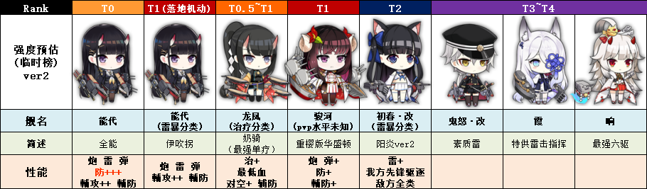 浮樱影像是碧蓝航线推出的全新新年活动。本次活动将推出6艘新樱樱舰以及大量新皮肤。下面就为大家介绍一下本次活动的攻略,以及新舰艇的数据和技能。 一、活动时间本次共开放2个活动章节,共2种难度模式。 第一部分开放时间:12月26日维护后~2020年1月9日下一部分开放时间:12月28日~2020年1月9日第一部分和第二部分分别有3个级别。难度可随意切换,进度单独保存。每成功击败一个boss关卡,即可获得活动兑换道具“勾玉”。在普通难度下,每天第一次通关即可获得3次“勾玉”。 下一章D3关卡100%通关后,就可以挑战SP关卡了。每天只能通关一次,可以获得大量“勾玉”。 另外,下一章D3关卡100%通过后,E.X海域将解锁。由于关卡难度较大,建议指挥官谨慎操作。 二、限时建造在战斗周期中,可以建造以下现役舰艇: 鸗(龙凤)超稀有2% 乌龟(骏河) 超稀有2% 秀(Noshi) 超级稀有0.5% 蕸(夏)精英2.5% 猤(鬼怒)精英0.7% “貅”字也可通过活动海域兑换、打捞获得; “粤”字也可以通过活动兑换获得。活跃角色的概率将在游戏中公布。 三、新舰船数据和技能 四、评价能代:产量水平高于Befa,低于Kedi(预计427)。火炮+炮弹和我的差不多,自律不是什么障碍。 如果15%的回避率得到落实,那么能贷将是完美的诠释。别说是T0,连EX等级都得考虑,或者重新划分光巡梯度。 它的生存能力与罗恩57波特兰处于同一水平(生存预期47000),但如果你作为轻巡洋舰获得这个生存能力且不受束缚,则可以争夺最佳的伤害承受能力(高机动性和高速输出相对流畅,有利于防空) 而且,也是解放输出重巡的阵地。你可以考虑将爆炸恶魔和伦敦与野代配对。 但如果着陆改成15%机动的话,存活率恐怕会高一点,也就过关了。 此时的数值是不受限制的雷击围,或者说是伊吹特围铠,与雷暴范畴的神通谷风相同。T1 龙凤:最强最稳定的单目标治疗,基本上是福米露露的上级治疗。 它还可以对潜艇进行挤奶并提供良好的防空能力。 不过她的治疗还需要看实战组合。理论上来说,和雪风/能代这样低血高生存伤害的人搭配是最好的。 T0.5~T1待定 骏河:无论是输出期望还是输出方式都和华盛顿太相似了。这是华盛顿的翻版。 但还有一个额外的辅助能力 T1初步评价,pvp等级未知,等待氧化钙评价 (华盛顿可以准备进入次要名单,并失去一个同位置的支持) 初春改:差不多是阳炎改装了,先把雷暴T2扔掉吧。 鬼怒·改霞响:等级都比较低,没有太多绝活,T3~T4 |
