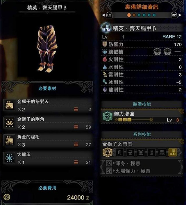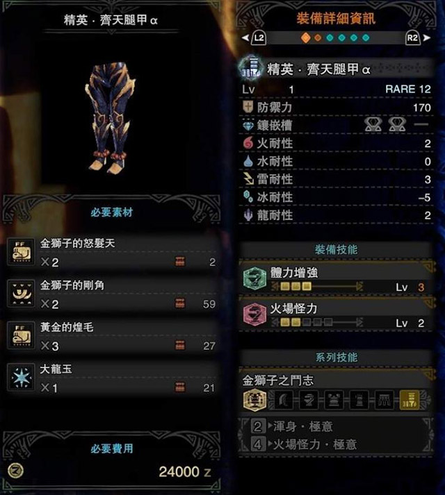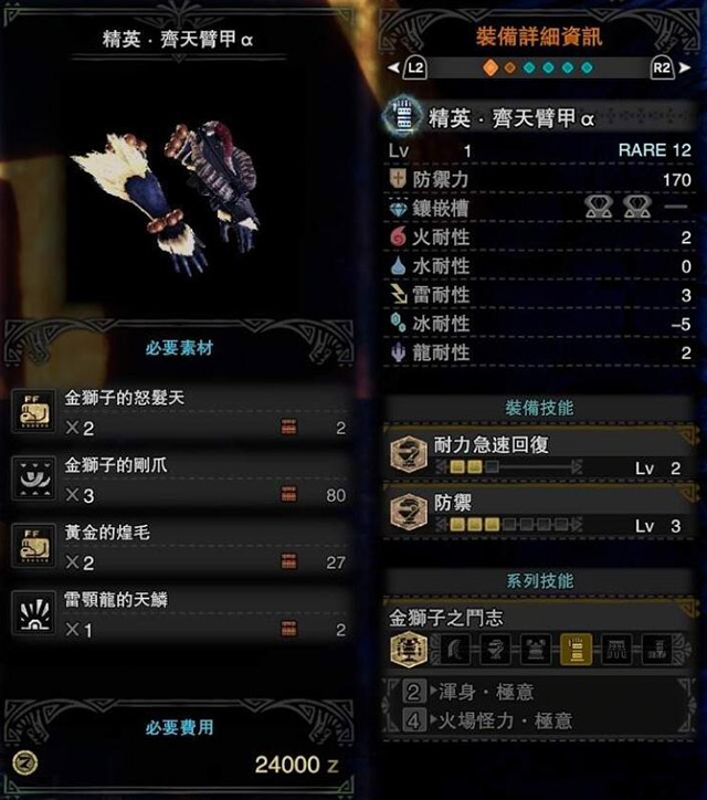 冰原烈金狮也加入了战斗。这次对付烈金狮子的铠甲也有了新的,技能也是全新的。很多朋友都在寻找烈金狮铠的性能描述。我就分享到这里,有需要的猎人不妨参考一下。 贝塔()套装 上半身效果 阿尔法()套装 上半身效果 激昂金狮子武器性能图鉴点击查看猛爆碎龙防具性能点我查看猛爆碎龙武器性能图鉴点击查看 |