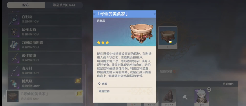 如何使用Genshin Impact便携式锅炉?原神1.1版本上线了全新烹饪道具——寻仙美食。使用它可以让你快速做饭,而无需回城寻找做饭的地方。使用起来非常方便。 物品:寻找永生的美食家 图纸获取方式:璃月声望升到5级使用方法:1. 单击并使用鼠标在角色面前创建一个方便的烹饪锅; 2.附近进入战斗状态时,道具会被破坏; 3、设置后,《鲜鲜美食》会进入300秒冷却时间,300秒后,「寻仙的美食家」将自动消失。 所以该道具是一次性使用道具用完后需要重新合成锻造。 |