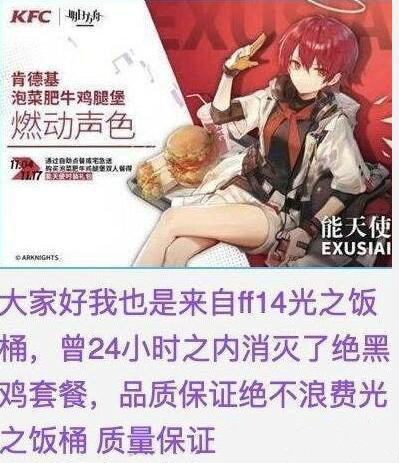 相信很多医生都知道汉堡王一直在和明日方舟调情。尤其是每次明日方舟更新的时候,汉堡王都会抽出一套648送给玩家。这样玩家们就确信汉堡王似乎真的和明日方舟有联系了。不过,这件事有了新的进展,不过主角不再是汉堡王,而是肯德基。到底是怎么回事? 原来,网上突然流传一张明日方舟与肯德基联动活动的图片,还有天使的新皮肤。 随后,官方也确认了与肯德基联动的消息,活动预计于11月4日开始。消息公布后,人们兴奋地“罗德岛”,带上自己的“老婆”,吃着自己最爱的“胖家快乐基地”。简直就是双喜临门。 |