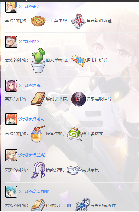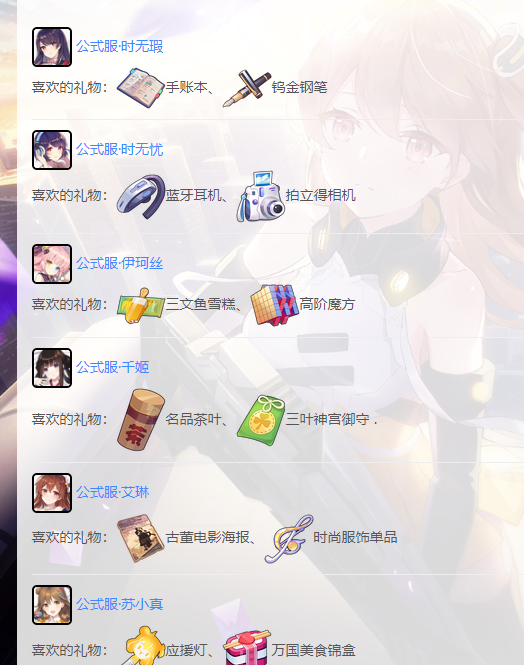 双视女孩喜欢什么礼物?提高双视卡好感度的快速方法,除了摸头之外,就是送礼物。每个女孩都有自己喜欢的东西,送出合适的礼物还会有额外的奖励。下面就为大家介绍一下每个女孩子都喜欢的礼物。 多肉盆栽和零食盒子是通用礼物,给所有女孩一个固定的恩惠(120/60/30)。每个女孩都有一份最喜欢的礼物。给对应的女孩一件最喜欢的礼物,每件礼物描述的基础好感度都会增加25%(比如给石无瑕送一本账本可以获得75好感度)。每个女孩最喜欢的礼物如下图所示。 |