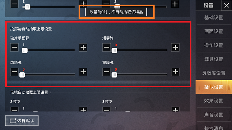 和平精英默认开启自动接听功能。当很多玩家遇到不想要的东西时,系统会自动捡起来。有时很方便,有时却很麻烦。下面介绍如何使用该设置。有需要的朋友不妨参考一下。 1.进入游戏后,点击右下角齿轮按钮,进入游戏设置。 2、然后选择右侧的“拾取设置”菜单,然后在菜单的左上角就可以看到自动代答的总开关。如果您选择关闭,游戏中将不再有任何自动拾取操作。 3.那么我们只是想不想捡某件东西怎么办?方法很简单,开启自动拣货,然后下拉菜单,找到你不想捡起来的东西,把数量调整到0即可。 |